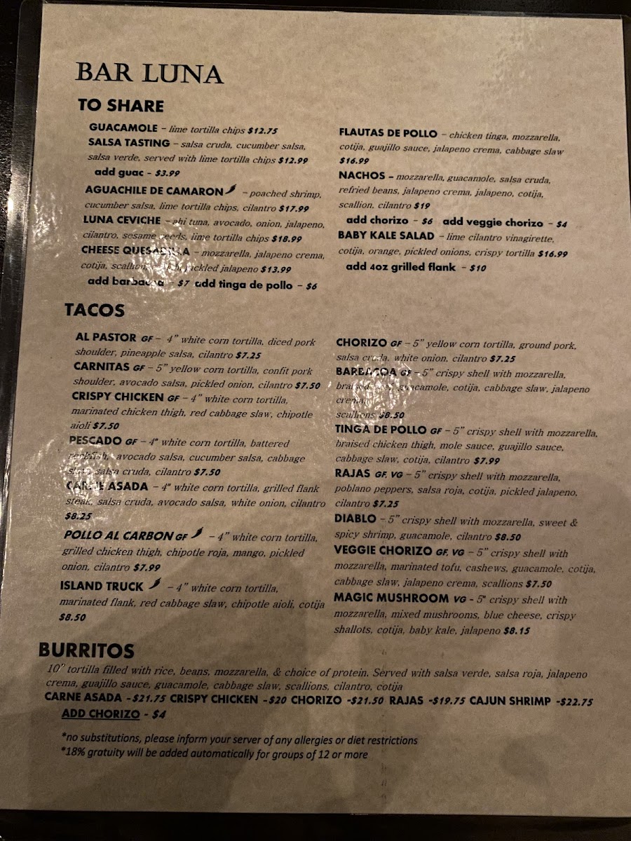 Guest reviews overflow with enthusiasm, highlighting the Luna fries and breakfast burrito as brunch must-tries, while taco aficionados rave about the exquisite texture and taste. The ambiance is equally captivating, providing a stunning backdrop for any meal. With top-notch ingredients and a dedicated team, Bar Luna has quickly become a favorite among locals and visitors alike. Don't miss out on this delectable escape; your palate will thank you.
